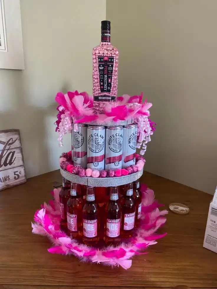 Making an alcohol tower on a tiered tray is a super fun idea for a 21st birthday party.