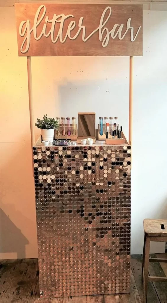 To set up, create a sparkly space with colorful glitter, mirrors, and LED lights to make it eye-catching. Offer a variety of glitter and adhesive gels for guests to create their own glittery looks.