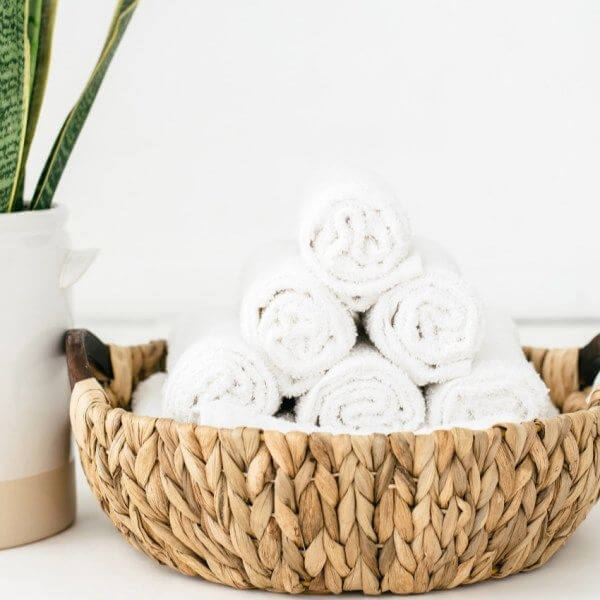 Switch up your bathroom style by rolling your hand towels in a spa-like stack next to the sink.