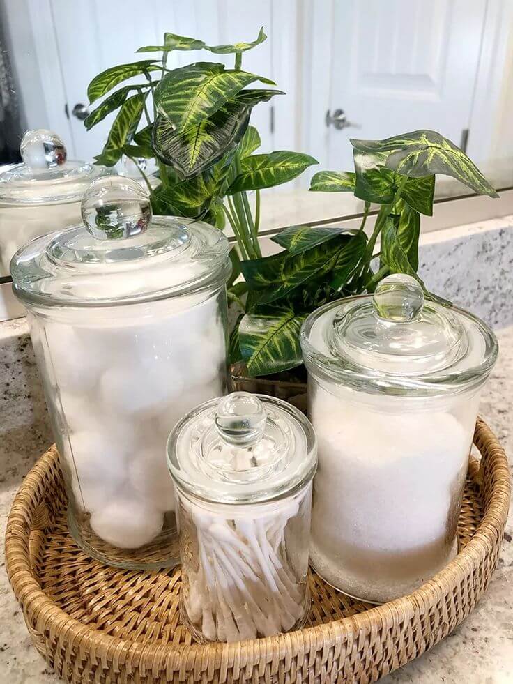 Using apothecary glass jars in your bathroom not only adds a spa-like touch but also serves as excellent organization on the bathroom counter.