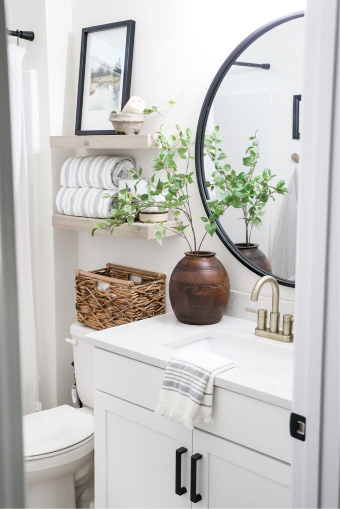 Instead of using lots of little things to decorate your bathroom counter, go for one big statement piece. It could be a big plant, a piece of art, or a bunch of decorative items like vases.