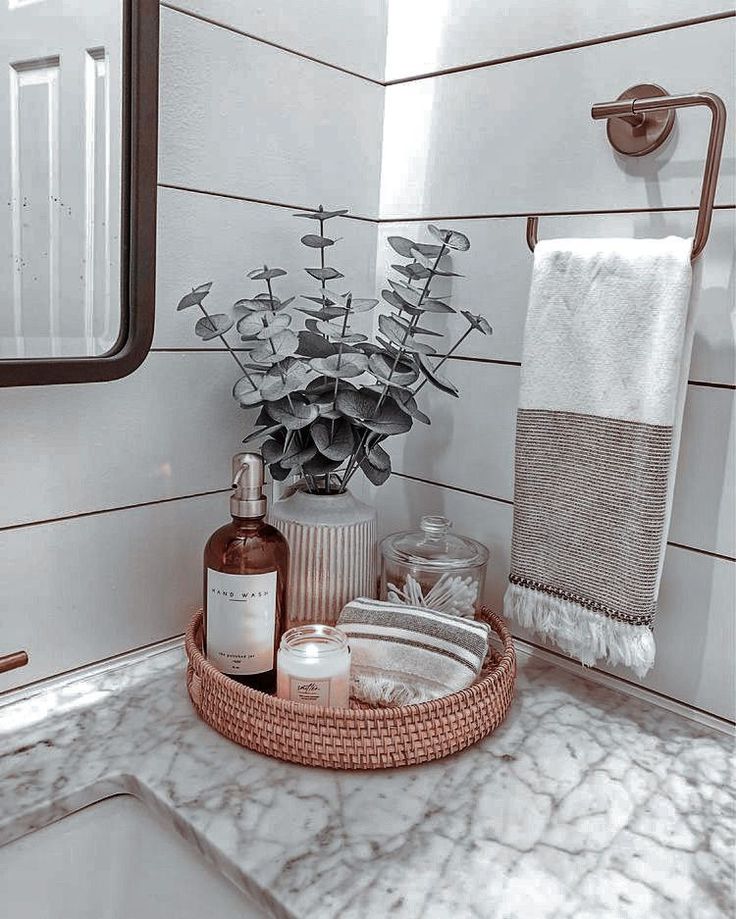 A simple way to decorate your bathroom counter is by adding flowers or plants. Choose colors that go well with your bathroom and your style.