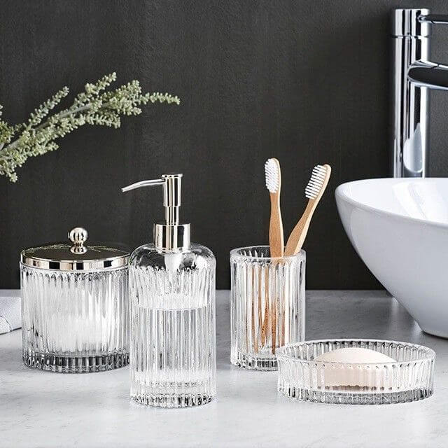 Go for a matching set of soap dispensers, toothbrush holders, and tissue box covers to make your bathroom counter decor look put together.