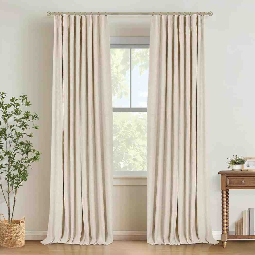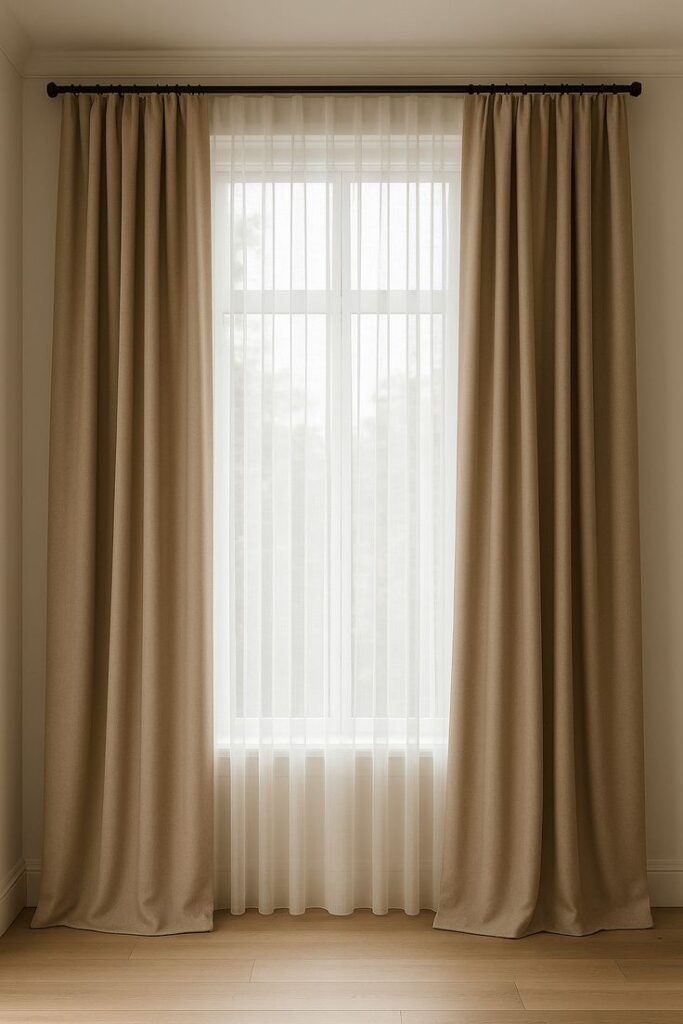 Incorporating grommet-style panel curtains in beige doesn’t completely block the light, but also maintains a clean and cohesive appearance that calms the eyes.
