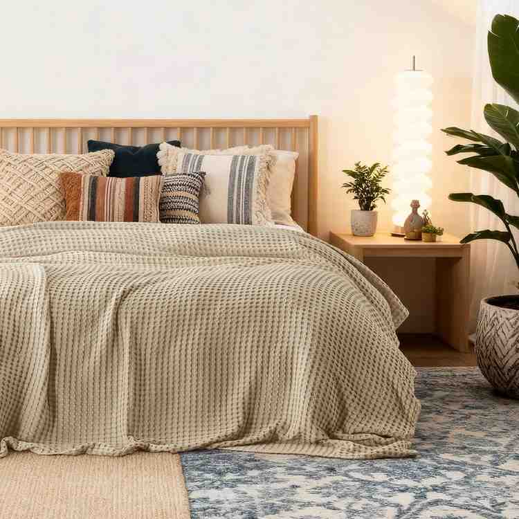 The natural texture and light beige hues promote a tranquil ambiance, setting the stage for a super chill night’s sleep.