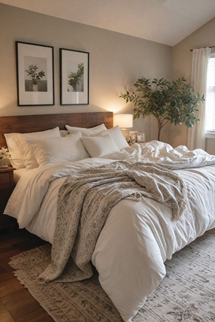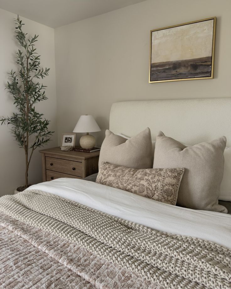 Alternatively, you can place a beige throw blanket at the foot of your bed, it’s a timeless touch that never goes out of style.