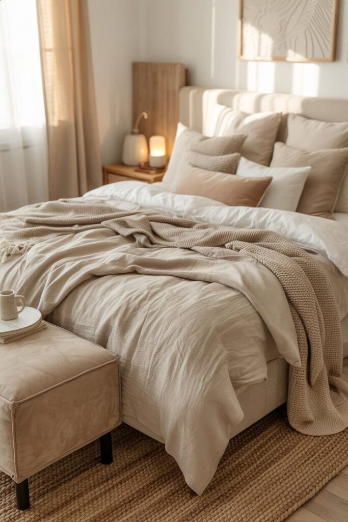 Choose beige or neutral-toned bedding for a calm and unified appearance.