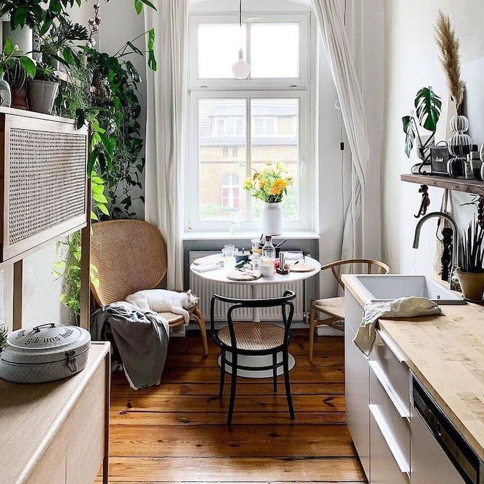 A single long bench against a wall with a table and a couple of chairs on the other side works in narrow kitchens.