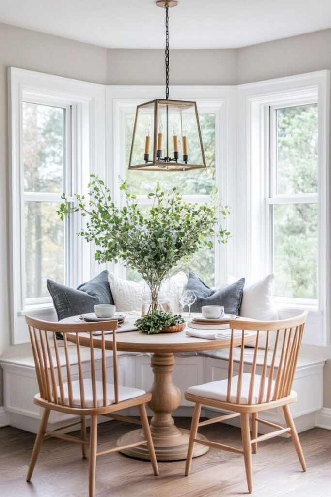 A bench on one side and chairs on the other make your nook feel balanced and practical.