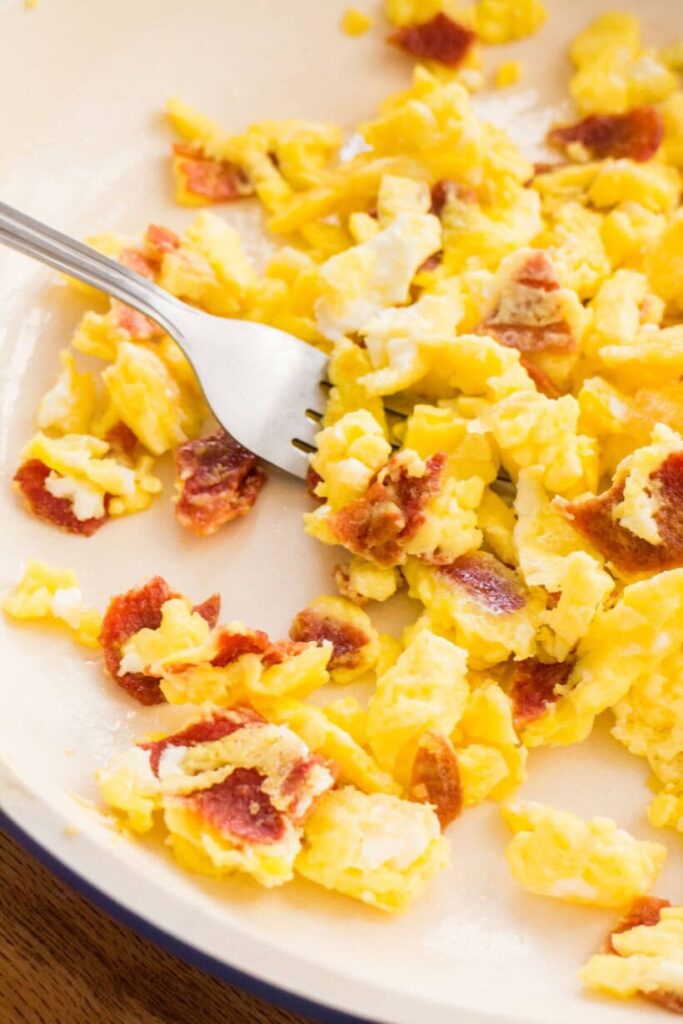 Crispy bacon mixed into soft eggs with melted cheddar is hard to mess up.