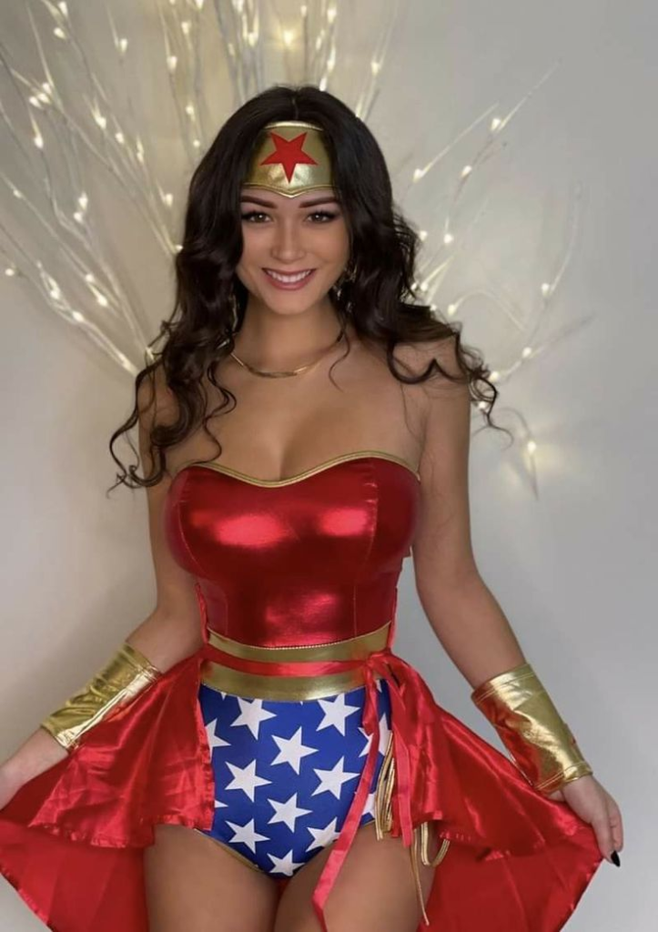 A gold tiara, red corset, blue skirt, and boots complete the iconic look.