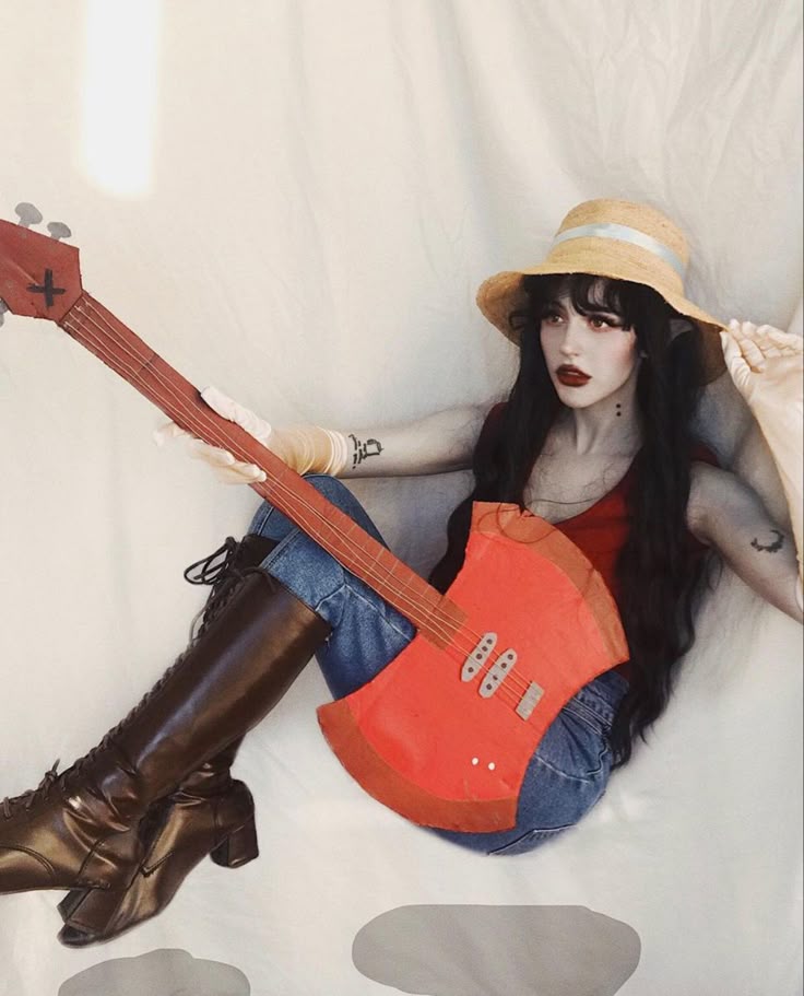 Her signature look includes a red tank top, ripped jeans, and a bass guitar prop.