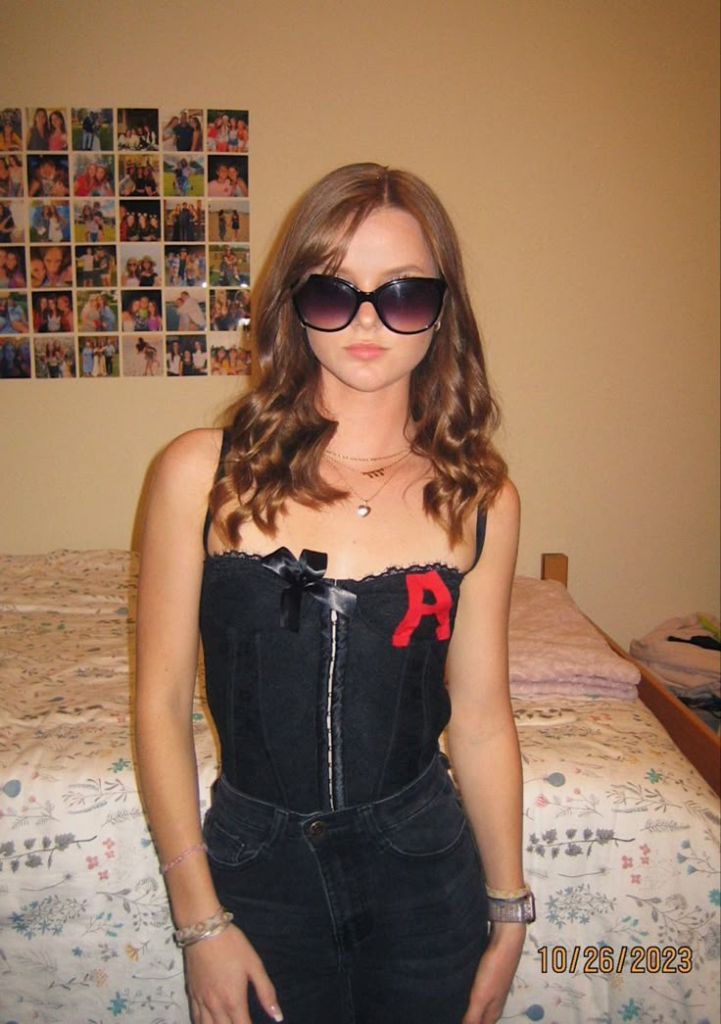 Olive’s red corset with the scarlet letter “A” is a funny, flirty brunette costume.
