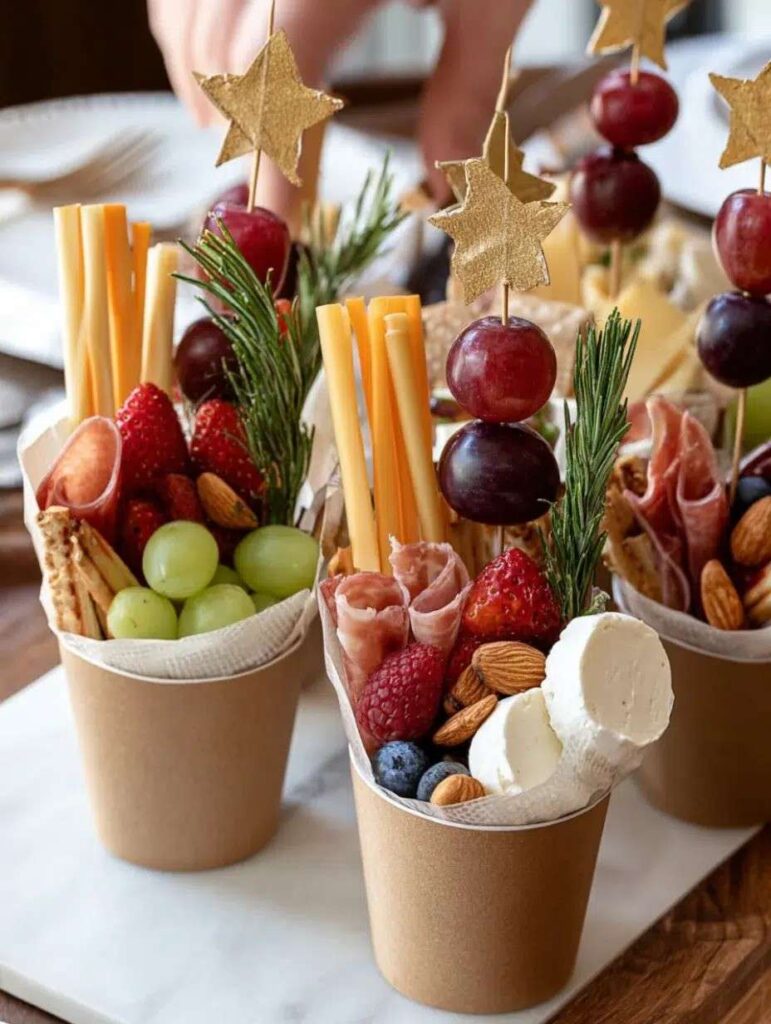 These crowd-friendly charcuterie cups focus on mild cheeses, easy-to-eat fruits, nuts, and simple crackers.