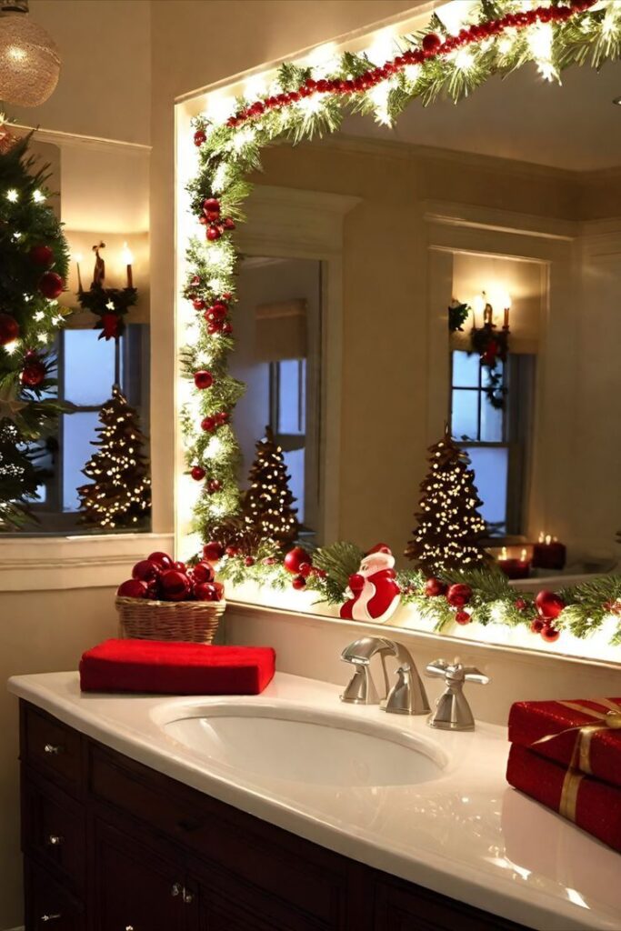Drape a small Christmas garland around the edges of the mirror and tuck in mini ornaments or berries for extra charm.