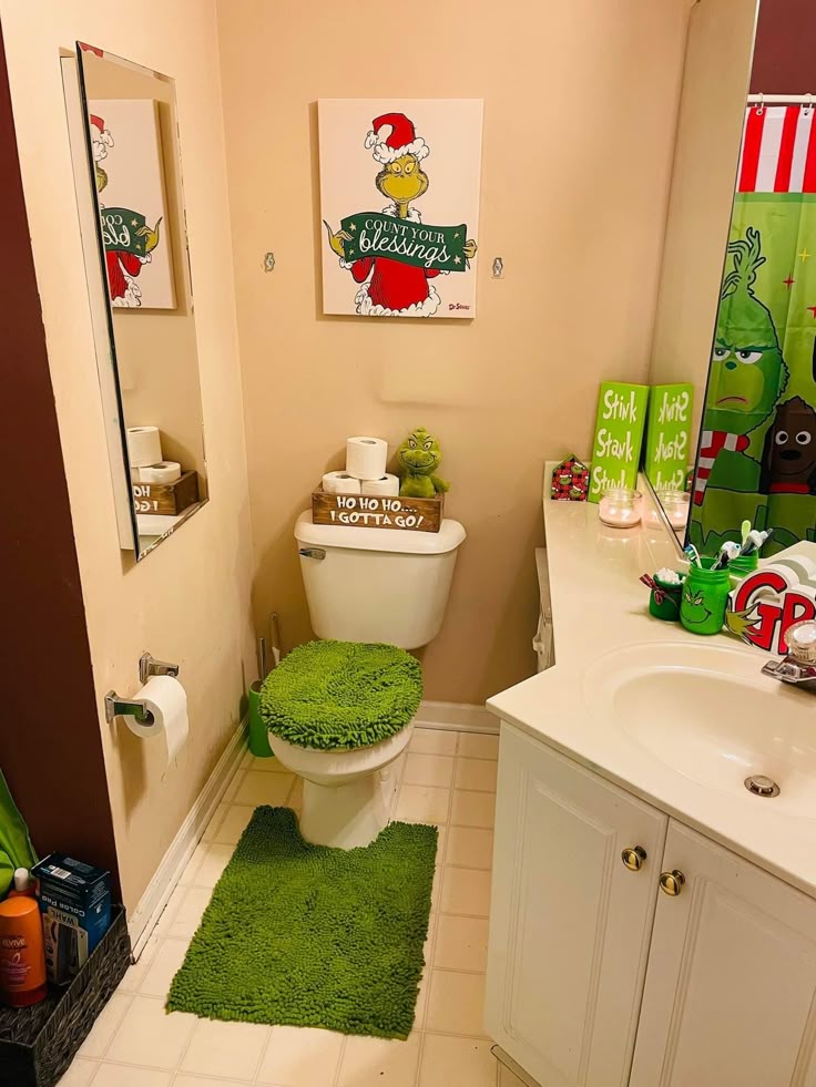 Stick “Stink, Stank, Stunk” decals on your mirror, and add green towels or a Grinch bath mat for a fun twist.