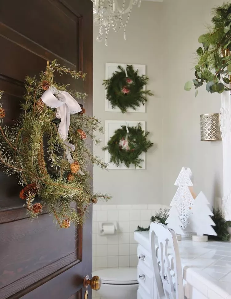 Choose a mini berry wreath or a frosted pine one to hang above your toilet or on the bathroom door.