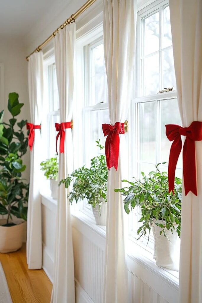 Add a velvet ribbon to each curtain tie or even to the curtain rod ends, and suddenly your room looks like a holiday photoshoot without spending anything.