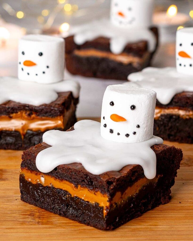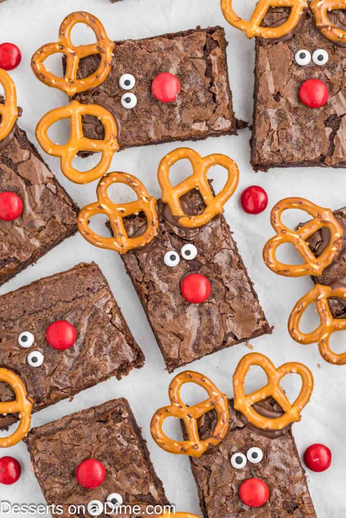 A couple of pretzel antlers, candy eyes, and a red M&M nose instantly turn a regular brownie into Rudolph, and honestly, people eat them faster when they look cute.