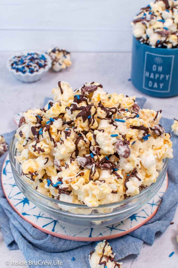 You toss warm popcorn with shredded coconut and chopped almonds, then drizzle everything in melted white chocolate until it clumps together in the best possible way.