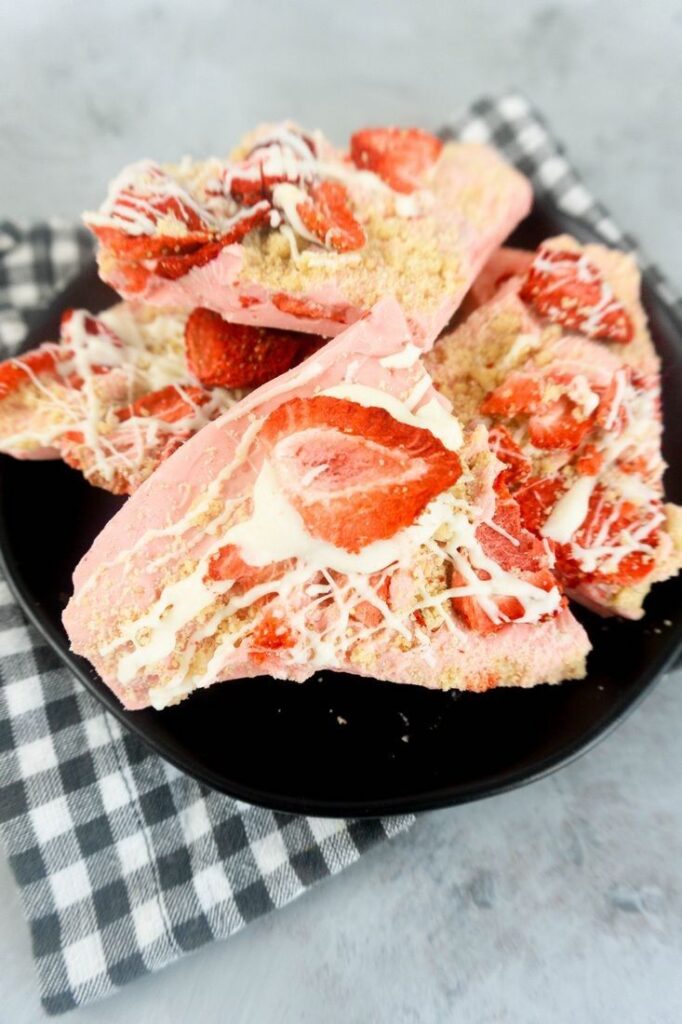 This bark uses freeze-dried strawberries and crushed shortbread cookies mixed into melted white chocolate.