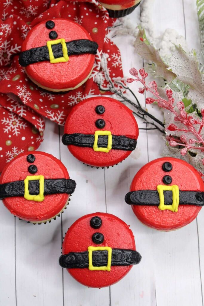 Use red frosting for Santa’s suit, a black strip of fondant for his belt, and a gold candy buckle.