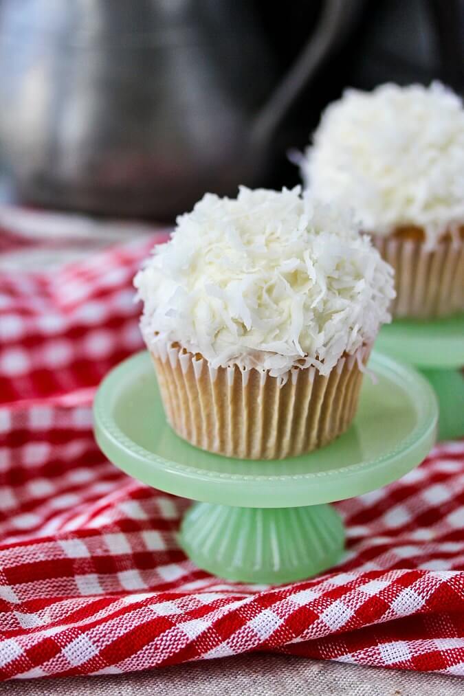 The cupcakes are soft vanilla, topped with a fluffy coconut frosting that looks like fresh snow.