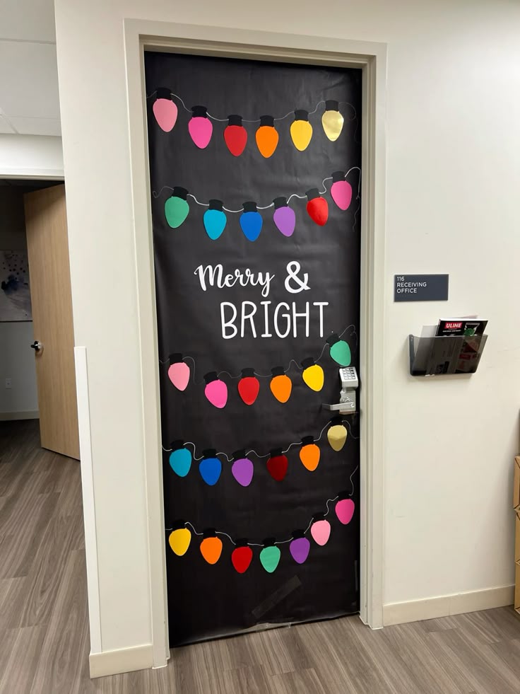 Cut colorful paper bulbs and string them across the door with black tape as the wire.