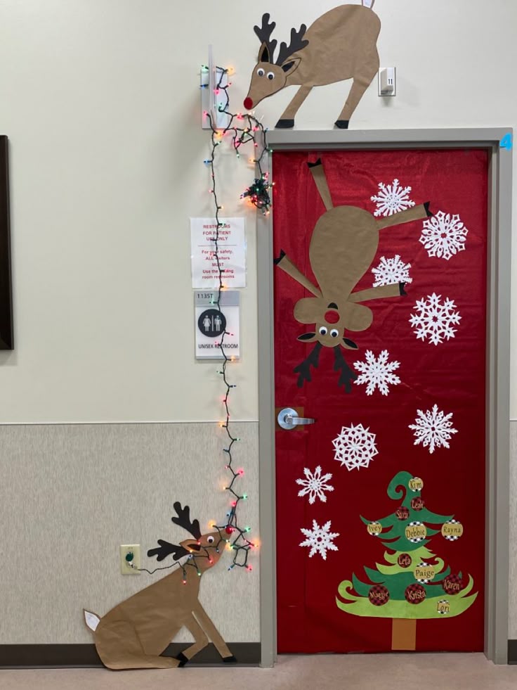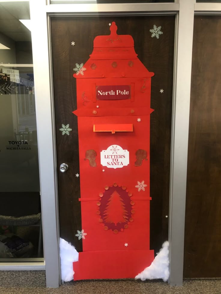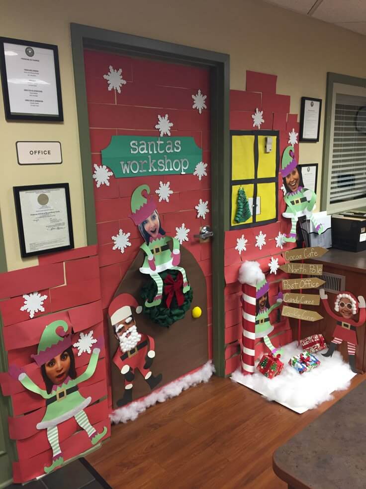 Make your door look like the entry to Santa’s workshop using red paper, fake snow, and “Elf Staff Only” signs.