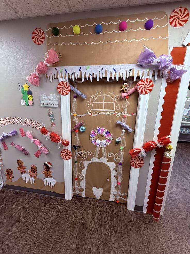 Turn your door into a gingerbread house with candy canes, frosting lines, and gumdrop stickers.