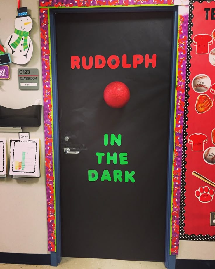 Cover your door in black paper, glue one big red pom-pom in the middle, and add the text: “Rudolph in the Dark.”
