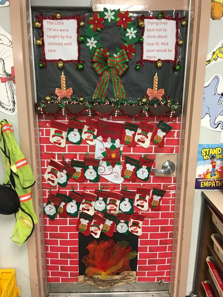 Make your door look like a brick fireplace using red paper and black construction paper for the “logs.” Hang mini stockings labeled with everyone’s names.