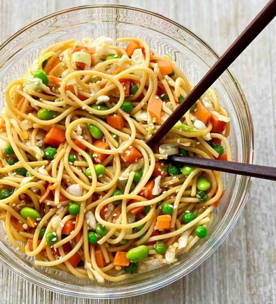 Cold noodles with shredded veggies (cabbage, carrots, bell peppers), a sesame-ginger dressing, and chicken or tofu.