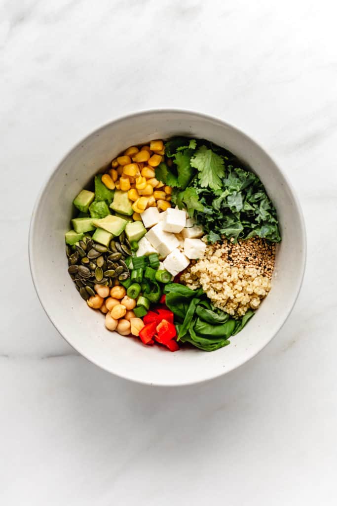 The key is building it right. Quinoa on the bottom. Greens on top of that (so they don’t get soggy). Then roasted veggies, then protein (chicken, chickpeas, or tofu). Dressing on the side until you’re ready to eat.