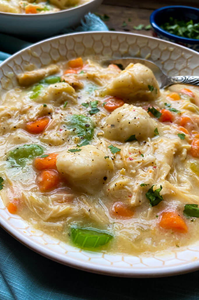 Pillowy dumplings float on top of a creamy chicken stew that smells like home itself.