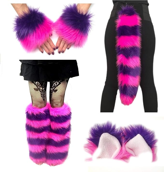 Think purple and pink stripes, a big grin, and maybe even a fuzzy tail for playful energy.