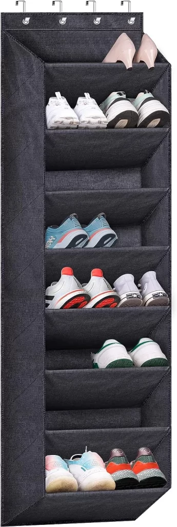 You can easily hang it over your door, and it has many pockets to hold your shoes.