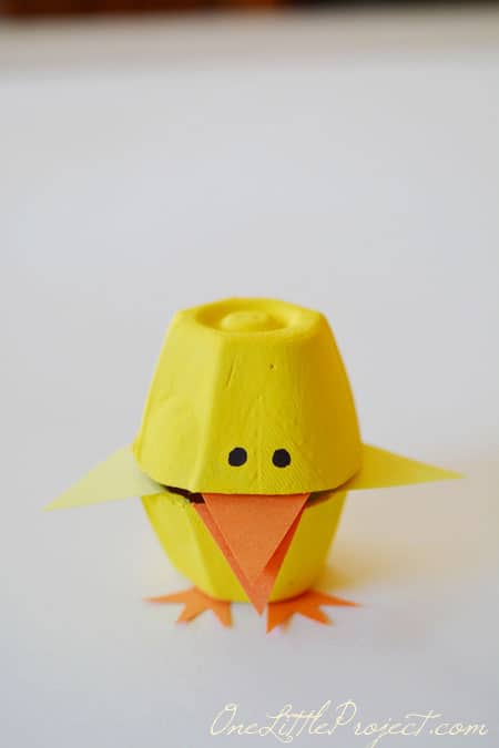 Cut apart an egg carton so each cup becomes a chick’s body. Paint them yellow.