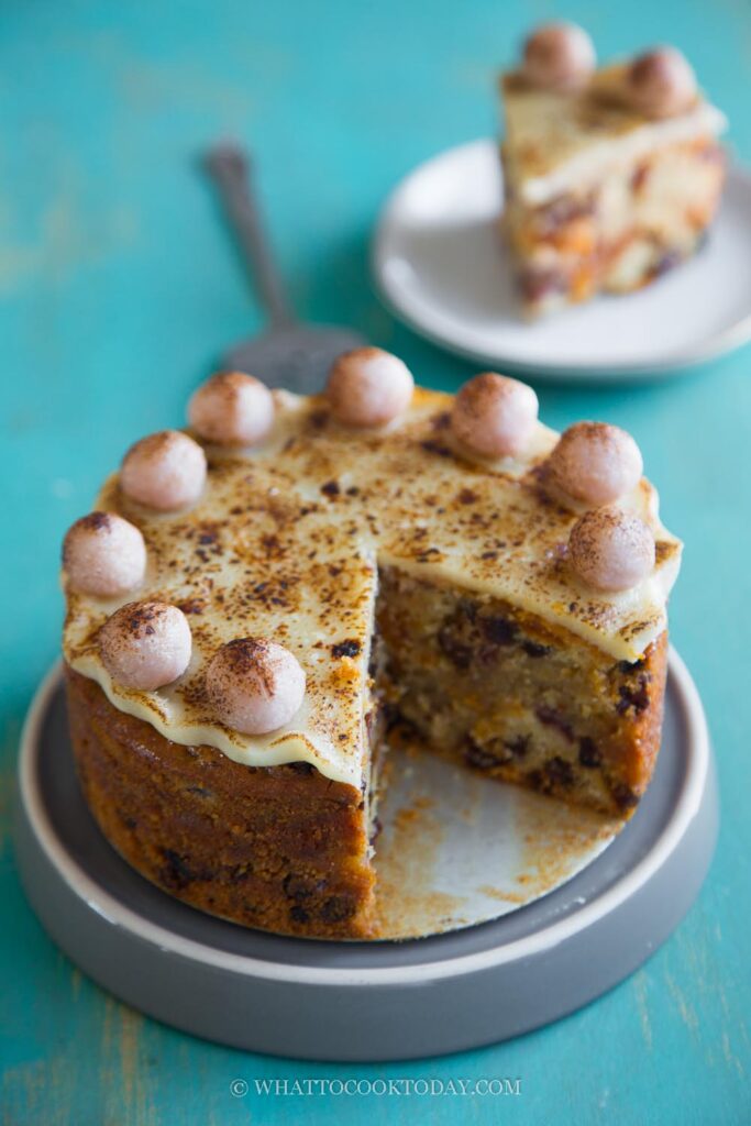 British Easter cake with marzipan and fruitcake.