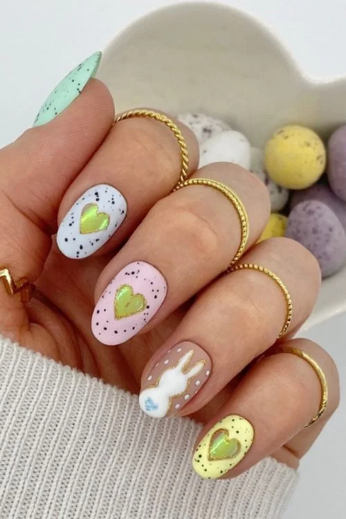 This design combines tiny heart accents with a speckled eggshell pattern, creating a look that screams creativity without trying too hard.