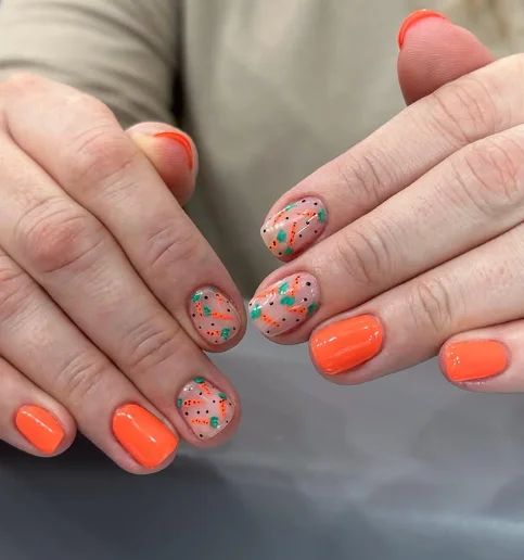These orange nails bring on the fun with adorable carrot designs, complete with leafy green tops.