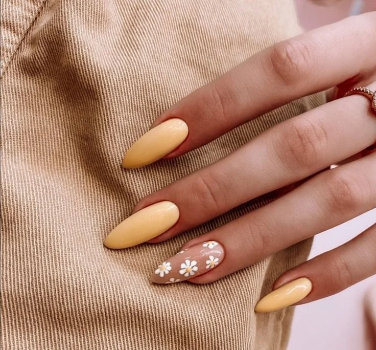 The contrast between the soft, neutral tones and the cheerful details makes for a manicure that feels both elegant and full of life.