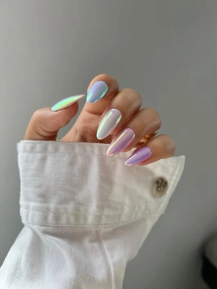Chrome pastels give Easter nails a luminous, almost holographic effect that feels anything but ordinary.