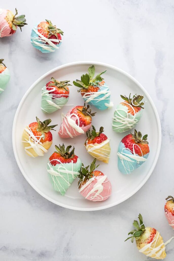 Dip strawberries in chocolate and add pastel sprinkles or a drizzle of white chocolate.