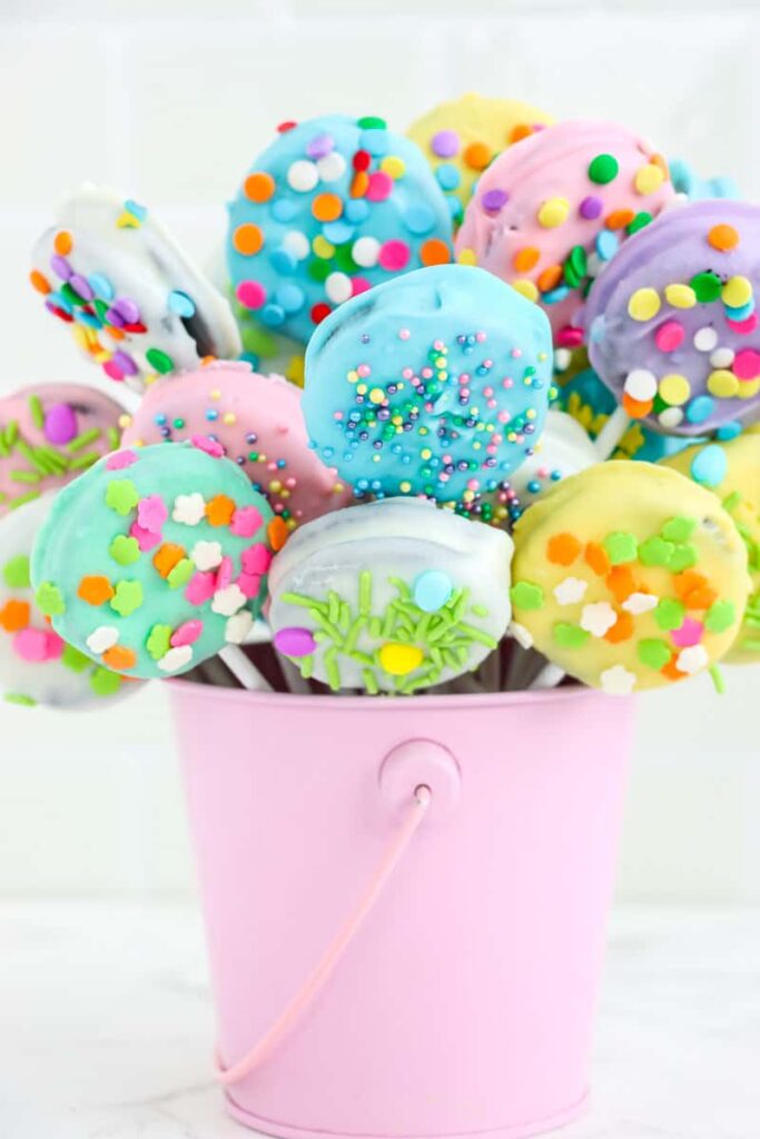 Stick Oreos on lollipop sticks, dip them in melted chocolate, and decorate them like bunny faces.