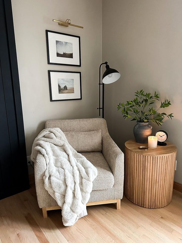 Add a small side table for your coffee (because you’re not balancing that on a book), and a floor lamp that makes the space usable at night.
