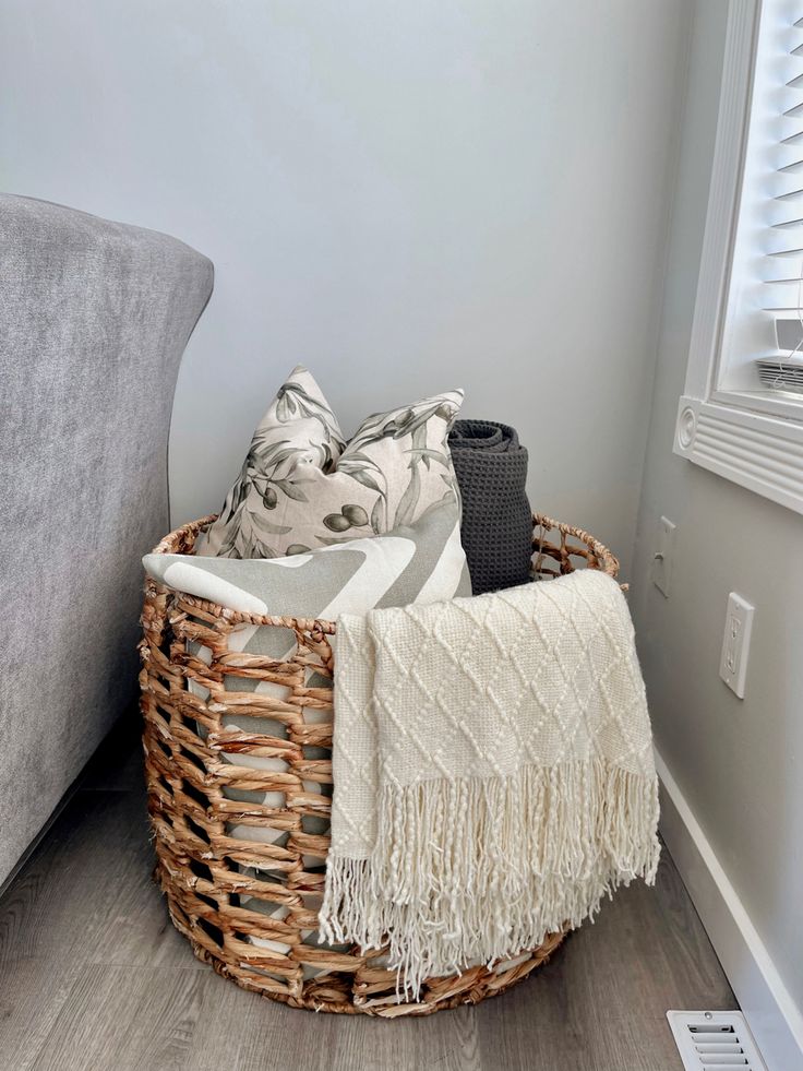 A structured basket with a throw casually placed inside gives the impression that the space is used, not staged.
