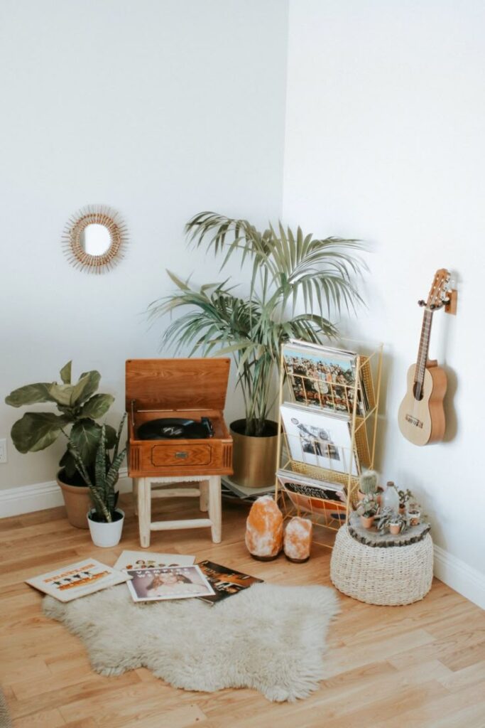 A small cabinet, a record player, and a few stacked records turn your corner into something personal.