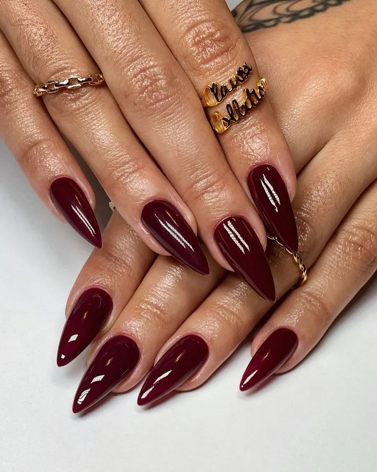 Nothing beats welcoming the spooky season with burgundy red nails that look almost like wine. This deep, rich color is both bold and elegant, making it the perfect choice for autumn.