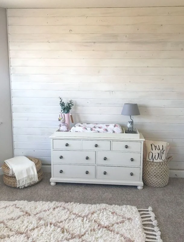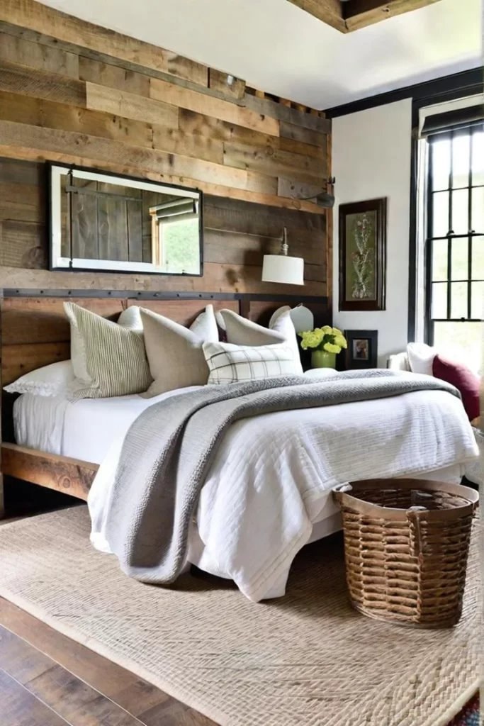 If your farmhouse bedroom feels too plain, consider installing a reclaimed wood accent wall behind the bed.